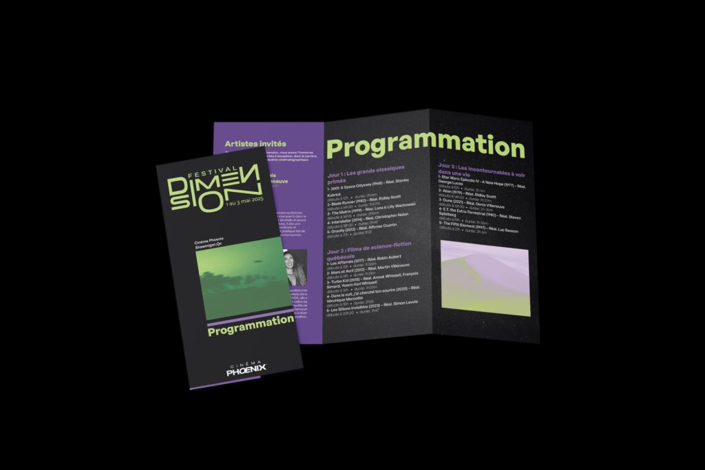 Création de l’identité visuelle complète du festival Dimension, dédié au cinéma de science-fiction. Le concept repose sur une esthétique postmoderniste mêlant typographie forte, grilles graphiques et imagerie futuriste.