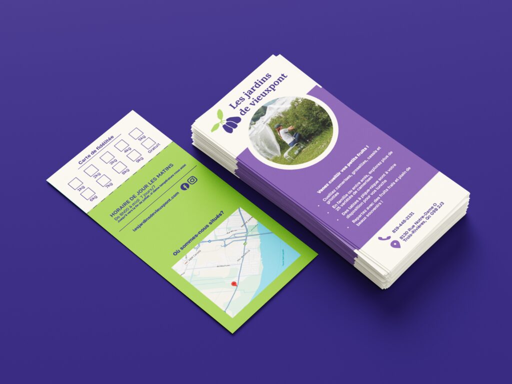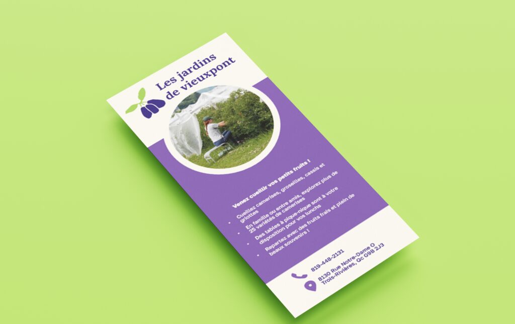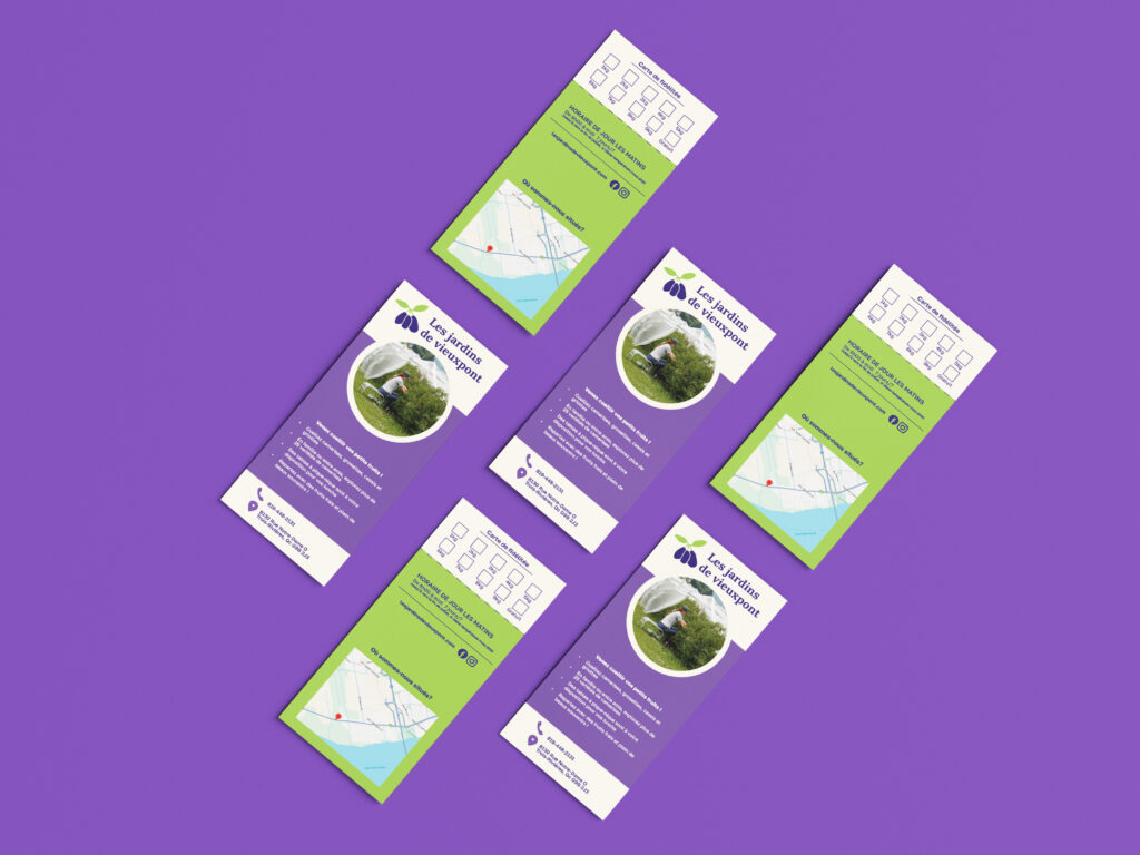 Conception d’un dépliant promotionnel pour les Jardins de Vieuxpont intégrant une carte de fidélité détachable. Le projet vise à allier information et fonctionnalité dans un format pratique et attrayant.